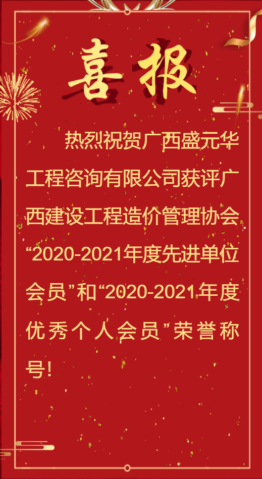 | 【喜訊】熱烈祝賀廣西盛元華獲評廣西建設工程造價管理協(xié)會“2020-2021年度先進單位會員、優(yōu)秀個人會員”兩項榮譽稱號 |