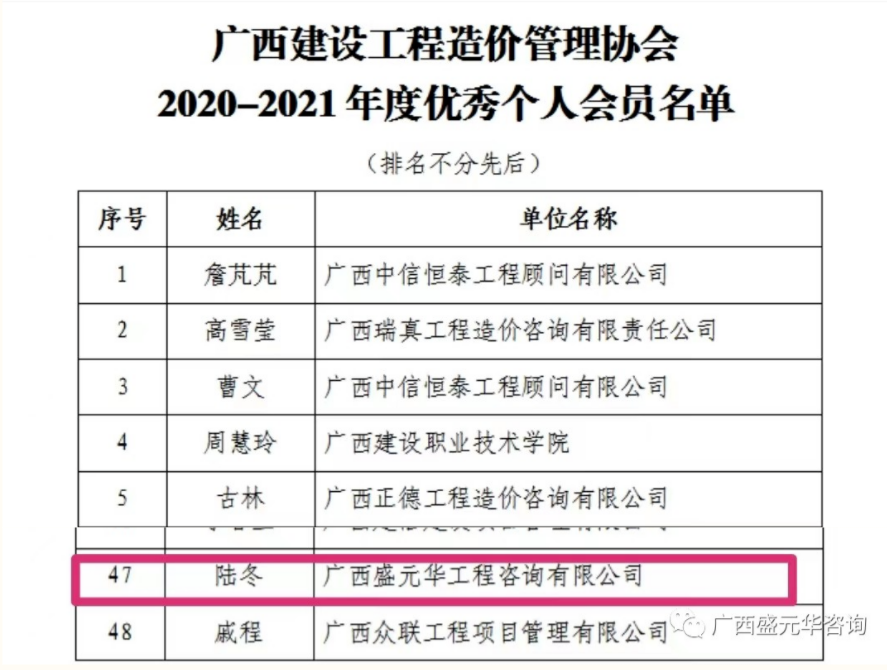 2022年7月5日,廣西建設工程造價管理協(xié)會發(fā)布《關于公布2020-2021年度先進單位會員和優(yōu)秀個人會員的通知》,表彰了經(jīng)過專家委員會評定、名單公示等嚴格程序最終評選出的46家“先進單位會員”及48名“優(yōu)秀個人會員”。廣西盛元華再次脫穎而出,榮獲“2020-2021年度先進單位會員”榮譽稱號。同時,我公司副總經(jīng)理、司法鑒定中心主任陸冬榮獲“2020-2021年度優(yōu)秀個人會員”榮譽稱號。