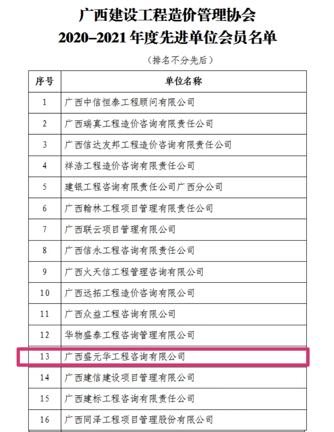 據(jù)悉,廣西盛元華至2019年以來蟬聯(lián)獲得廣西建設工程造價管理協(xié)會的先進單位會員,這不僅是行業(yè)協(xié)會和社會各界對廣西盛元華篤行不怠,砥礪奮進為廣大客戶提供高品質(zhì)服務的肯定,更激勵了每一位盛元華人以“誠信為本 有諾必踐”為宗旨,在未來的工作中不斷提高服務品質(zhì),提高行業(yè)競爭力而不懈努力!
