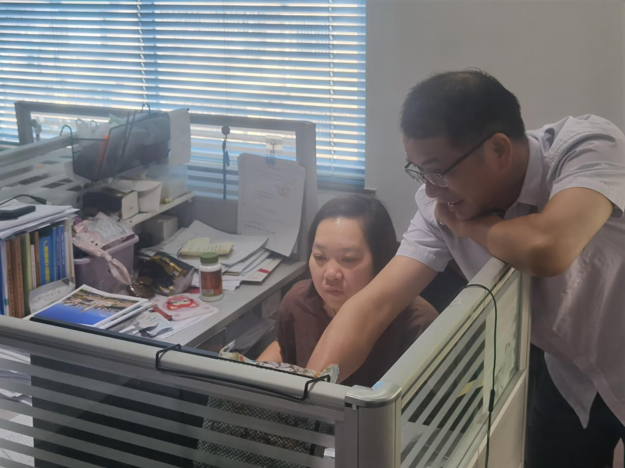 總工辦總工黃群在檢查分公司成果文件并指導(dǎo)業(yè)務(wù)員規(guī)范開展相關(guān)工作