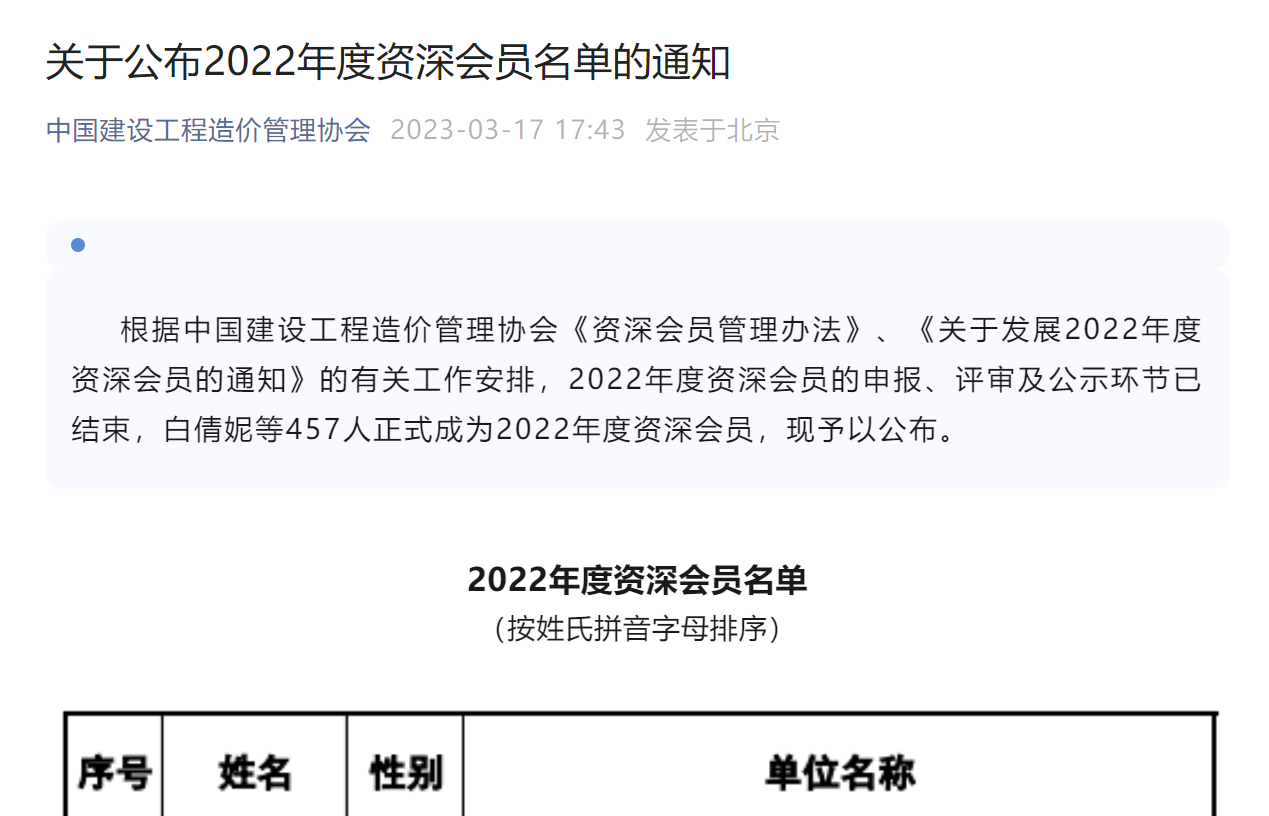 根據(jù)中國建設工程造價管理協(xié)會《資深會員管理辦法》、《關于發(fā)展2022年度資深會員的通知》的有關工作安排,2022年度資深會員的申報、評審及公示環(huán)節(jié)已結束,在公布的名單中,我集團副總經(jīng)理陸冬、總經(jīng)理助理謝宇翔正式成為中國建設工程造價管理協(xié)會資深會員。